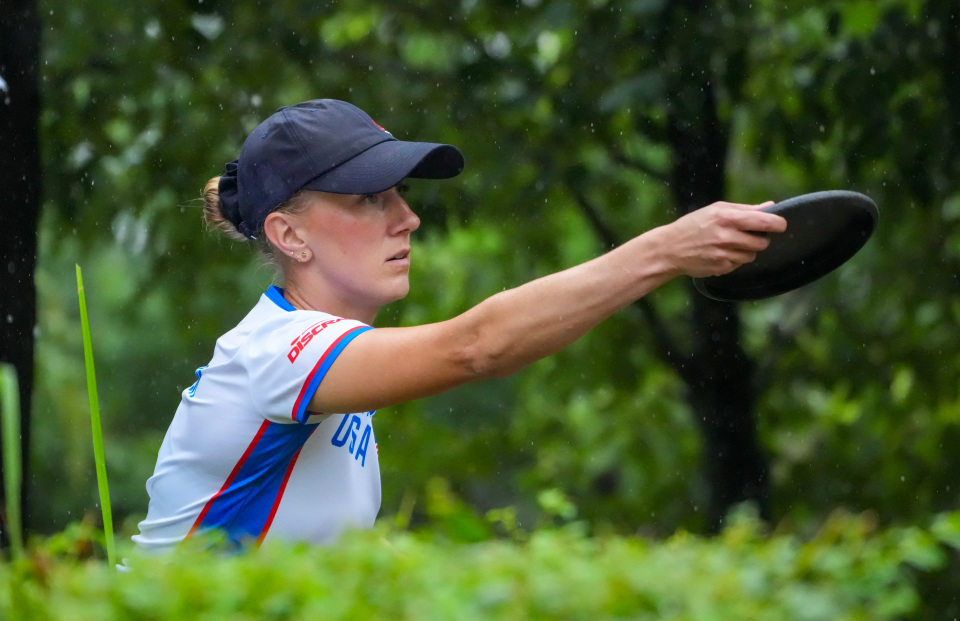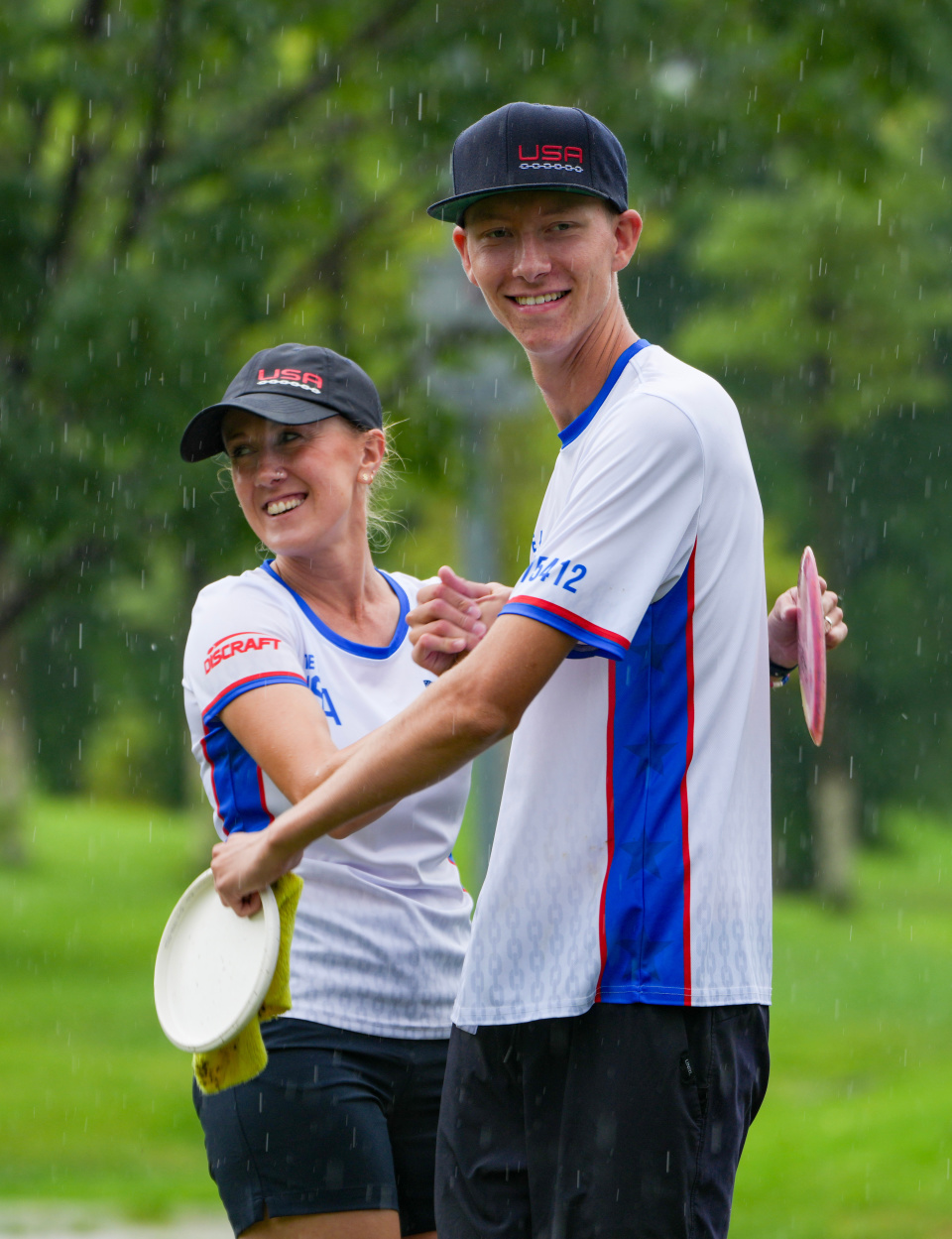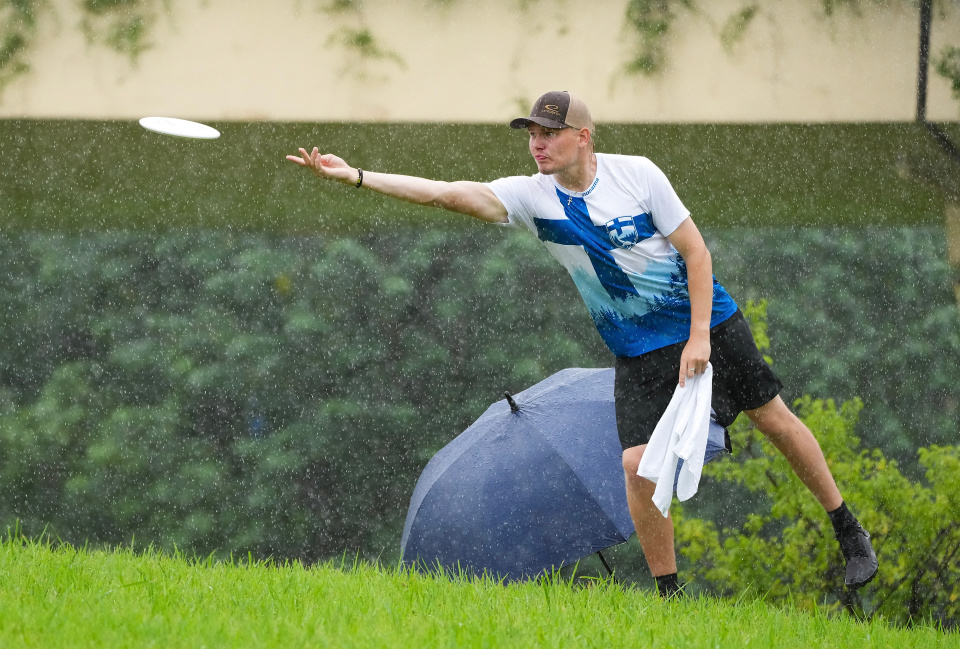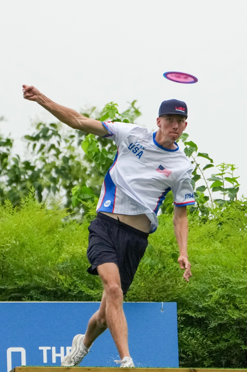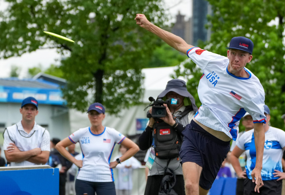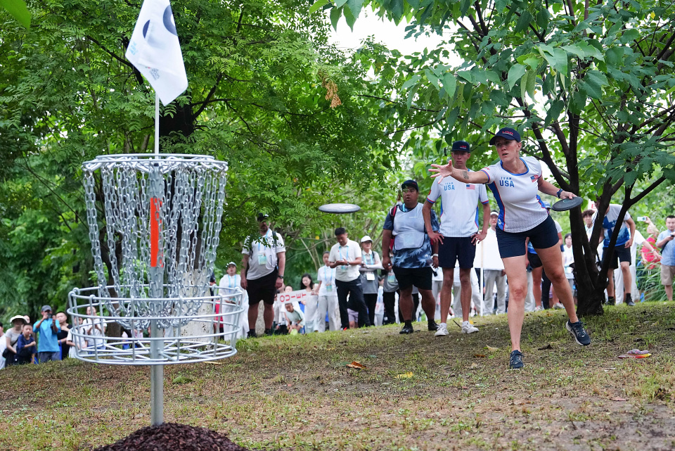 当日,在2025年成都世运会掷准飞盘混合双人决赛中,美国队选手布尔/甘农战胜芬兰队选手图赫卡宁/萨洛宁,获得冠军。8月10日,美国队选手布尔在比赛中。新华社记者 陈欣波 摄