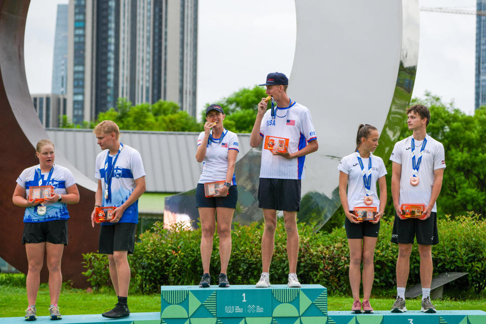 8月10日,冠军美国队选手布尔(右三)/ 甘农(左三),亚军芬兰队选手图赫卡宁(左二)/萨洛宁(左一)、季军拉脱维亚队选手巴洛迪斯(右一)/佩克塞娜(音)在颁奖仪式上。新华社记者 陈欣波 摄