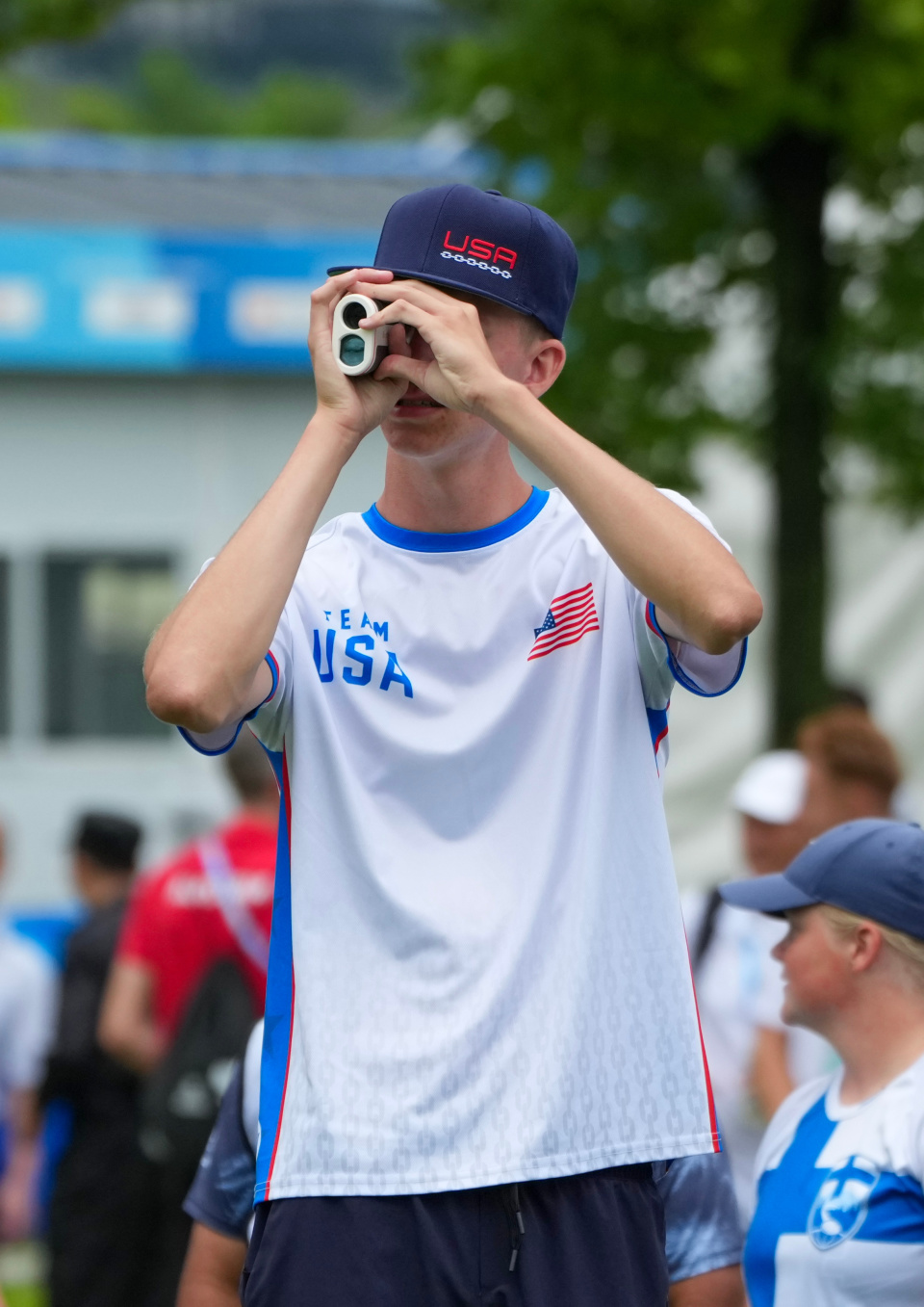 8月10日,美国队选手布尔在比赛中使用测距仪测距。新华社记者 陈欣波 摄